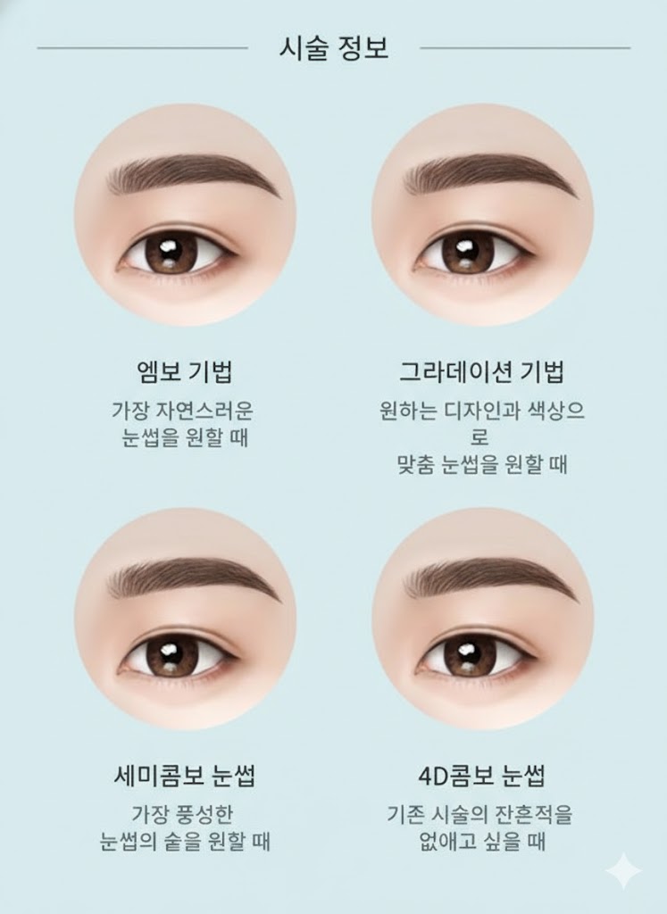 A. 콤보(결과 면), 섀도운기법(면)을 추천 드립니다. 결이 연해지는 것 보다 면이 서서히 연해지는 것이 더 오래가는 것처럼 느껴지실 거에요. 저희는 진피-표피층 사이에 가볍게 하는 시술로 잔흔이 남지 않아 매년 트렌드에 맞게 재시술 받으시면 됩니다.