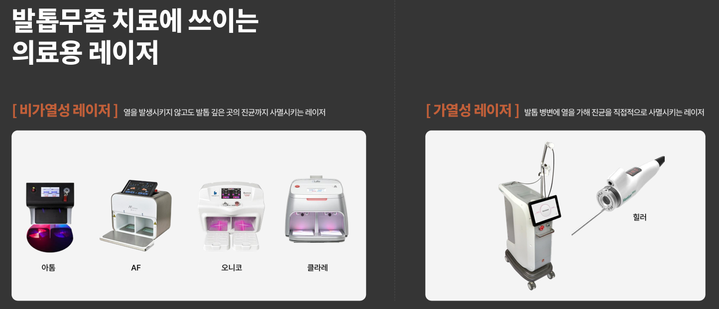 원리: 고온의 열 에너지를 무좀균이 있는 부위에 집중 조사하여 균을 즉각 사멸시킵니다.