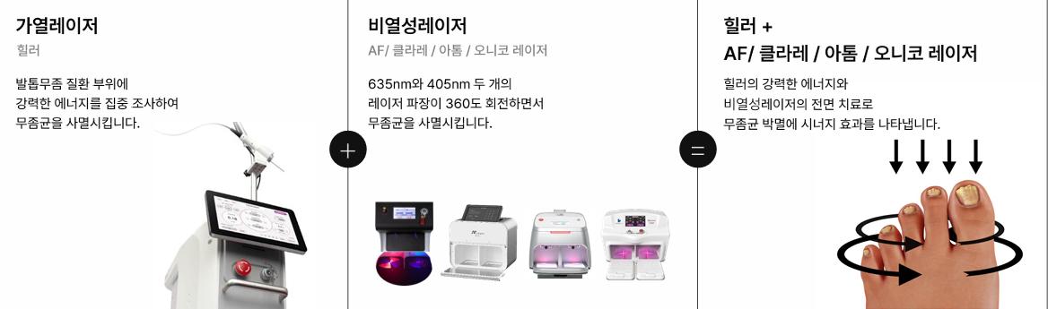 레이저 열로 진균을 파괴하는 방식입니다. 비열성레이저(오니코레이저, 아톰레이저, 클라레다이오드, AF레이저)와 가열성레이저(힐러 등) 등을 이용해 발톱무좀을 치료합니다. 두 가지 레이저를 듀얼로 사용하여 각자가 가진 치료의 효과를 융합하는 경우도  있습니다.